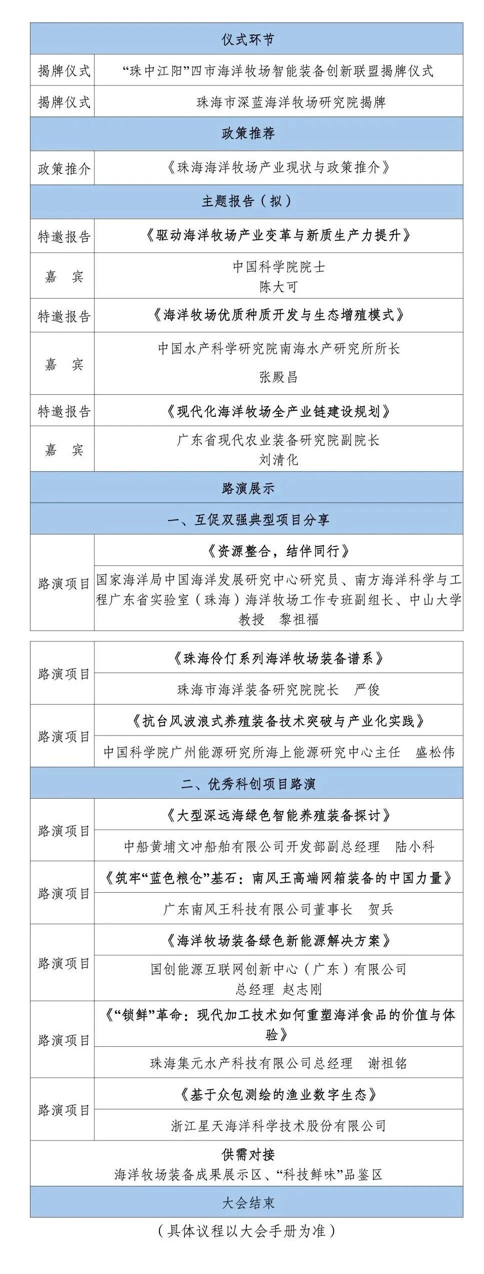 智库引领:特邀院士、权威专家解读政策趋势分享前沿技术;成果展示:集中展示智能养殖装备、海洋工程冷链加工等最新成果四市联盟:珠海、中山、江门、阳江携手成立智能装备创新联盟,共筑产业链生态;路演对接:多家企业现场路演,推动“研发一制造-应用一服务”全链合作;科技鲜味品鉴:现场品尝金枪鱼、东星斑等高品质海洋牧场产品大会主要议程免费参观参会名额领取扫描下方二维码或点击链接填写报名信息名额有限额满即止大会报名链接https://www.wjx.cn/vm/rl9LWA.aspx# |