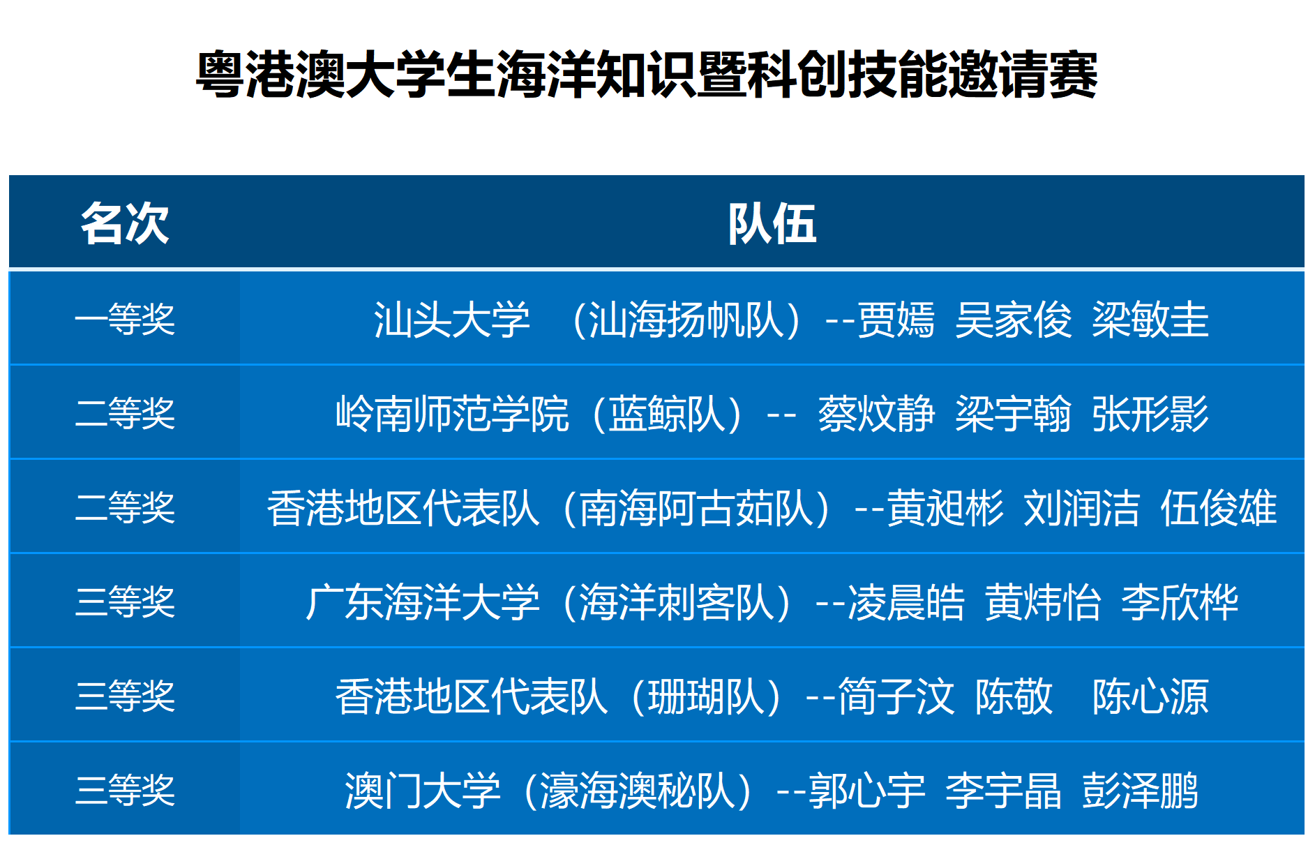 经过两个环节的角逐,汕海扬帆队摘得本届邀请赛的桂冠,蓝鲸队、南海阿古茹队荣获二等奖,海洋刺客、珊瑚队、濠海澳秘队荣获三等奖。一名参赛学生表示:“此次竞赛不仅使我们收获了知识和荣誉,还深切感受到了团队合作的力量。我们会持续热爱海洋,积极推广海洋科学知识,为守护蓝色家园作出贡献。”