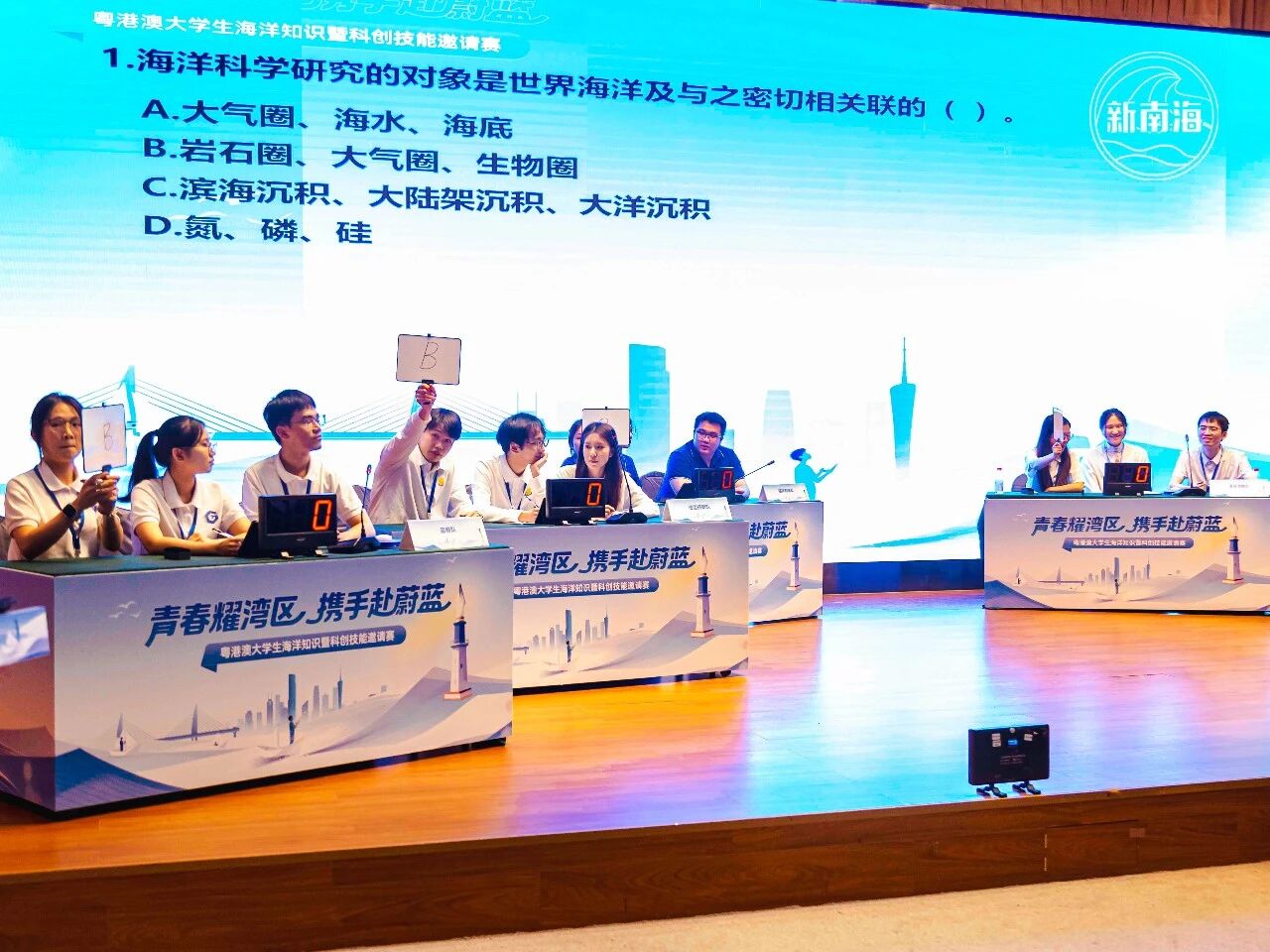 本次赛事由广东省自然资源厅(广东省海洋局)、广东省海防委员会办公室、共青团广东省委员会、自然资源部南海局主办;广东省自然资源厅事务中心、广东省海洋发展规划研究中心、自然资源部南海海域海岛中心、广东海洋协会承办;广东南油控股集团股份有限公司、中船黄埔文冲船舶有限公司、中国长江三峡集团有限公司广东分公司协办。赛事旨在普及海洋知识、提升公众海洋意识、推动海洋生态保护,助力实现人与自然和谐共生,同时为粤港澳大湾区海洋经济发展培育青年人才。 赛事汇聚了第15届全国海洋知识竞赛广东赛区大学生选拔赛决赛前三名的队伍:海洋刺客队(广东海洋大学)、蓝鲸队(岭南师范学院)、汕海扬帆队(汕头大学),香港赛区大学生代表队南海阿古茹队和香港大学生选拔赛决赛中其他优秀学生们组成的珊瑚队,以及澳门大学的濠海澳秘队。 比赛分为两大环节:海洋知识问答与船模制作及竞速比赛。知识问答环节设置共同答题、抢答题和风险题三个部分,题目涵盖海洋生态、资源开发、环境保护及海洋工程技术等多个领域,难度逐级提升。选手们沉着应对,展现出扎实的知识储备与临场应变能力。最终,汕海扬帆队以360分的高分领先。