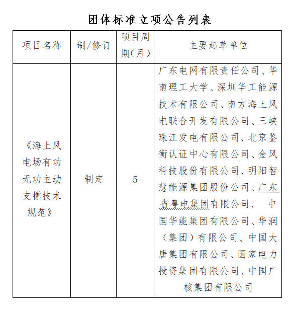 广东海洋协会关于《海上风电场有功无功主动支撑技术规范》团体标准立项的公告